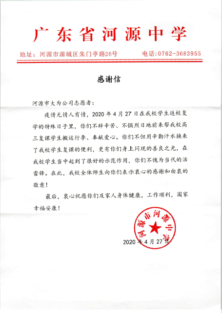• 2020-04-28河源中學致信感謝大為公司志愿者